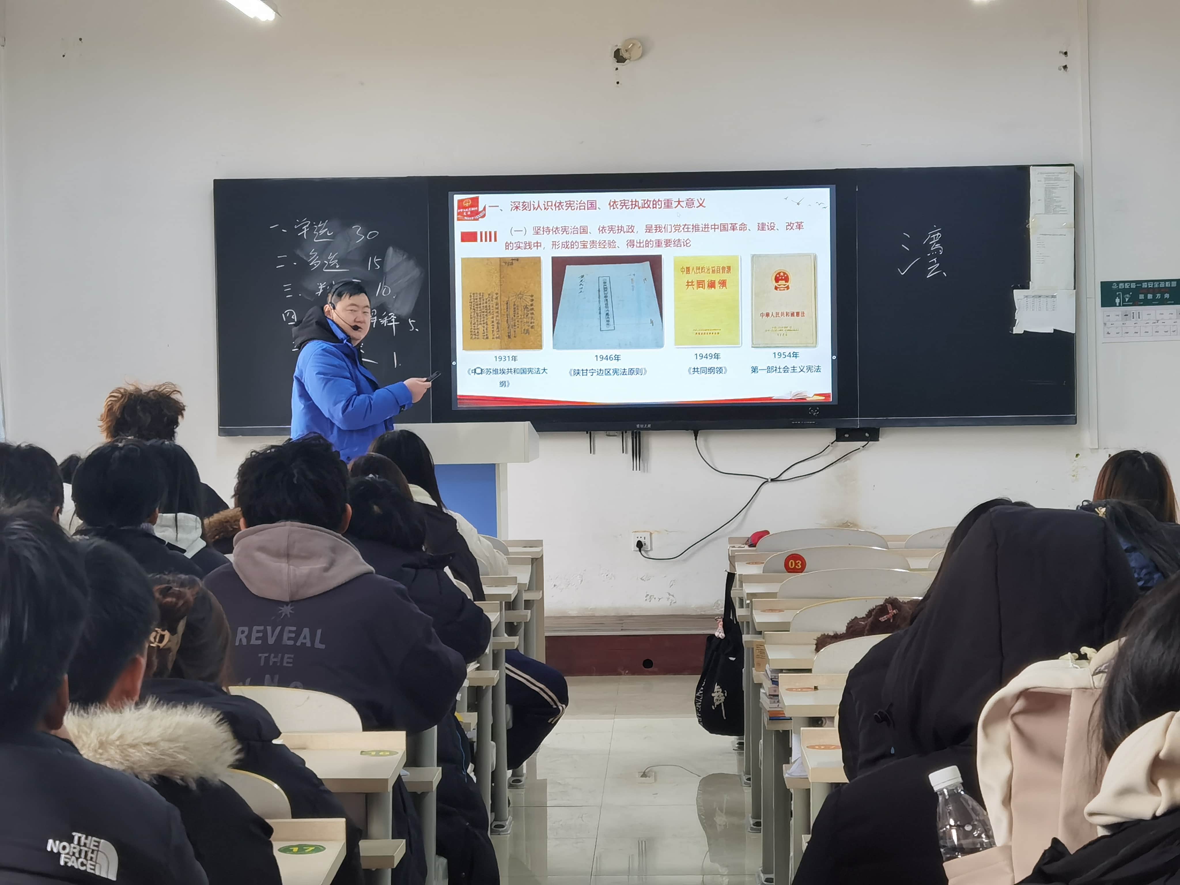 在《思想道德與法治》課堂上,李慧老師以“憲法與國家生活”為主線,結合我國憲法的發(fā)展歷程,深入淺出地闡述了憲法作為國家根本大法的崇高地位和重要作用。李老師通過解析憲法條文與日常生活的緊密聯(lián)系,引導學生認識到憲法并非遙不可及,而是貫穿于個人成長與國家發(fā)展的方方面面,是公民權利的保障書。她鼓勵同學們要增強憲法意識,從遵守校紀校規(guī)做起,自覺養(yǎng)成法治思維。