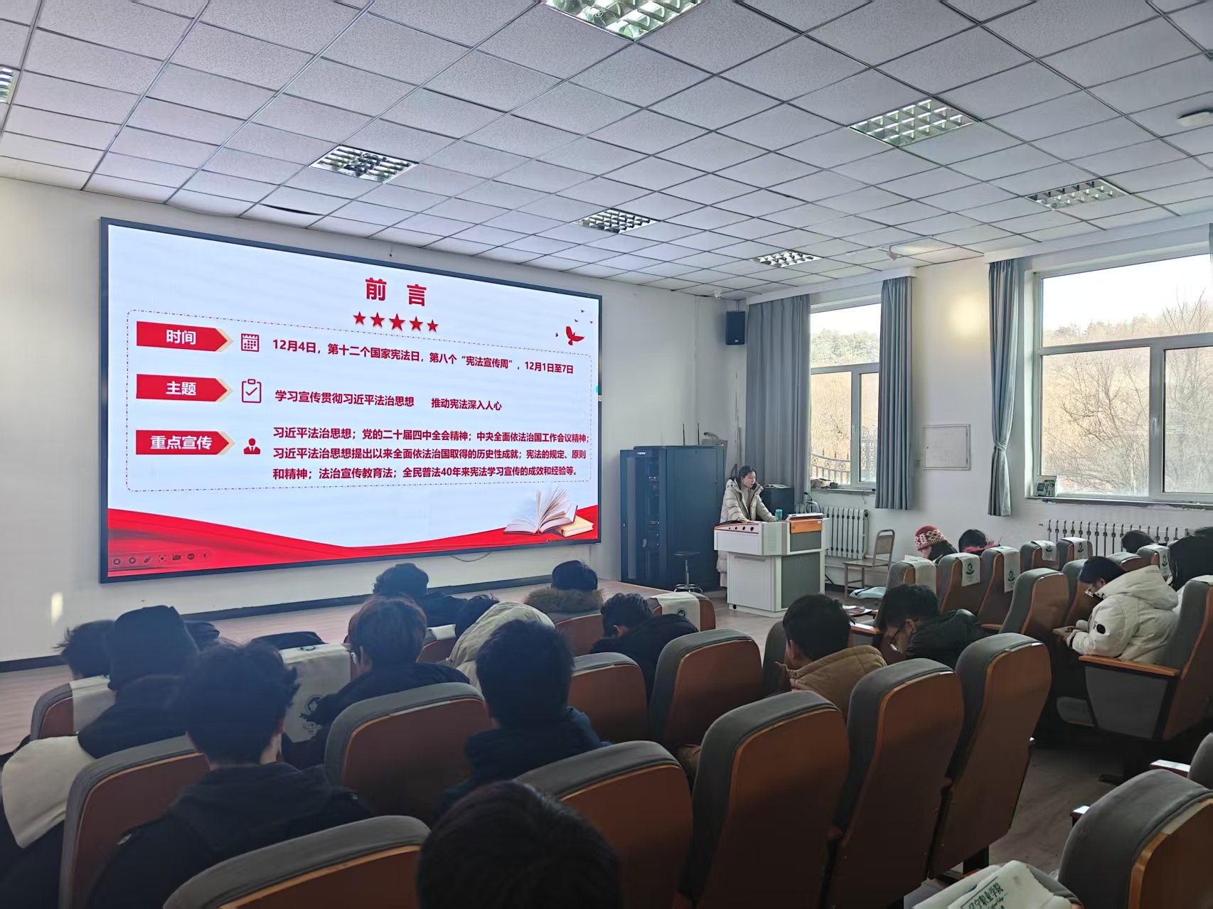 12月4日,在第十二個“國家憲法日”到來之際,馬克思主義學院(思政部)教師開展憲法宣講活動,為同學們帶來了一堂深刻而生動的法治教育課,在校園內營造了尊崇憲法、學習憲法、遵守憲法、維護憲法、運用憲法的濃厚氛圍。