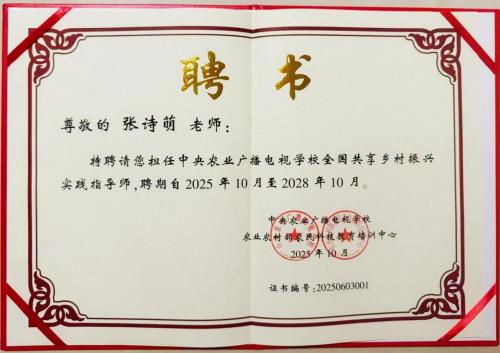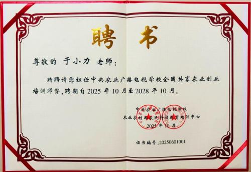 近日,中央農(nóng)業(yè)廣播電視學(xué)校農(nóng)業(yè)農(nóng)村部農(nóng)民科技教育培訓(xùn)中心正式簽發(fā)聘書我校于小力老師、張?jiān)娒壤蠋煈{借深厚的專業(yè)積淀與豐富實(shí)踐經(jīng)驗(yàn),分別受聘為“全國共享農(nóng)業(yè)創(chuàng)業(yè)培訓(xùn)師”“全國共享鄉(xiāng)村振興實(shí)踐指導(dǎo)師”。